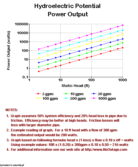 The amount of power available depends on the dynamic head, the amount of water flow and the efficiency of the turbine/generator combination. To get an idea about available power in watts, multiply the head in feet, times flow in GPM, times 0.18 times efficiency. The combined efficiency of the turbine and generator ranges from 40% to 80%, with higher efficiency at higher heads and for larger generators. To get a rough idea, use 0.50 (representing 50%) as a multiplier for efficiency. Here are example computations using the minimum parameters mentioned above.